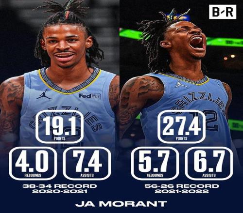 然后是2022-23赛季,莫兰特的表现依然是全明星级别,场均拿到26.2分5.9篮板8.1助攻,得分降低,但助攻生涯最高,灰熊也取得了51胜。