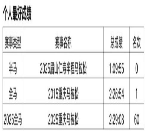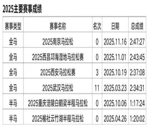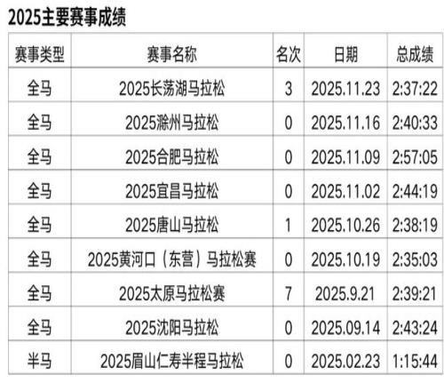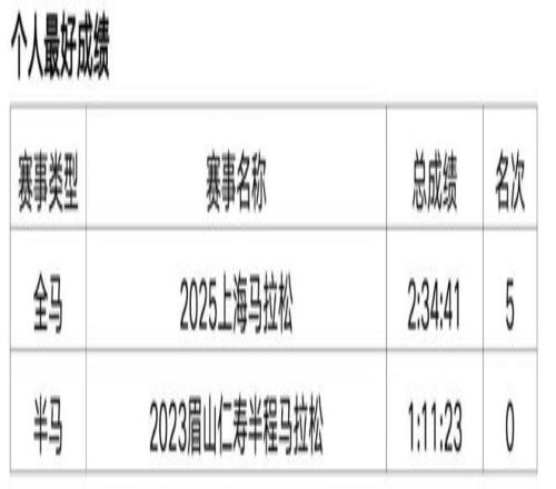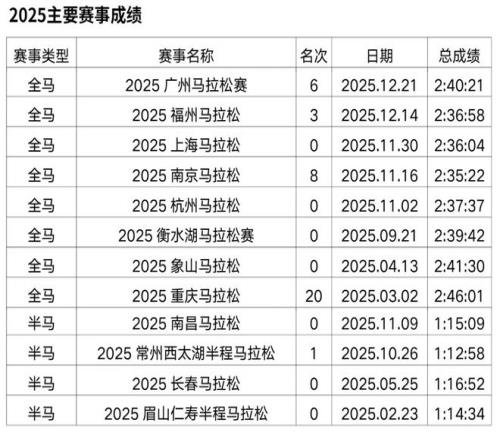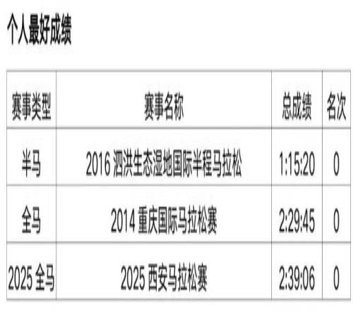 原从事办公室文员工作,2018年开始接触马拉松和越野赛,在此之前无专业队服役经历,高中时期在校练过一年400米专项。2019年首半马143,首全马316,2021年半马117,全马238,全程马拉松达标国家健将等级。