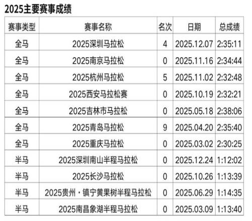 朱卿的全马PB来自2025年重马,2:30:25。她是近年马拉松赛道崛起的实力派名将,2023年12月因健身开启首马,从此一发不可收拾。短短两年间,她斩获武汉半马、湛江半马等多项赛事冠军,拿下杭马、青马等中国籍冠军,还曾获“大众一姐”称号并签约特步。她用汗水书写逆袭,以清醒心态面对起伏,成为跑圈励志标杆。
